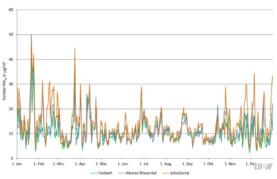 Description: null Feinstaub und Staubinhaltsstoffe in Schwarzwaldtälern Die LUBW Landesanstalt für Umwelt Baden-Württemberg führte im Jahr 2019 Messungen zur Bestimmung der Feinstaubbelastung in der Luft in den drei Schwarzwaldgemeinden Forbach, Kleines Wiesental und Schuttertal durch. Mit den Messungen wurde der Einfluss von Holzfeuerungen auf die Feinstaubbelastung untersucht. Die gesetzlichen Grenzwerte werden eingehalten Vom 1. Januar bis 31. Dezember 2019 führte die LUBW Messungen von Feinstaub (Partikel PM 10 und PM2,5) sowie Benzo[a]pyren durch. Wie in ganz Baden-Württemberg wurden in den drei Schwarzwaldtälern die Jahresgrenzwerte für Partikel PM 10 und PM 2,5 eingehalten. Der gemessene Jahresmittelwert von PM 10 mit 14 Mikrogramm pro Kubikmeter Luft und PM 2,5 mit 11 Mikrogramm pro Kubikmeter war in Schuttertal am höchsten, aber weit unter dem Grenzwert von 40 bzw. 25 Mikrogramm pro Kubikmeter Luft. Auch der Grenzwert des krebserregenden Benzo[a]pyrens wurde an allen drei Standorten um mehr als die Hälfte unterschritten. Damit werden die Ergebnisse aus der ersten Jahreshälfte 2019 bestätigt. Der Jahresverlauf der Tagesmittelwerte der Partikel PM 10 -Konzentration in den drei Schwarzwaldtälern kann Abbildung 1 entnommen werden, die gültigen und gemessenen Jahresgrenzwerte der Tabelle 1. Abbildung 1: Tagesmittelwerte der Partikel PM 10 -Konzentrationen in den Schwarzwaldgemeinden Forbach, Kleines Wiesental und Schuttertal im Jahr 2019 (Quelle: LUBW) Tabelle 1: Grenzwerte und gemessene Jahresmittelwerte der Luftschadstoffe PM 10 , PM 2,5 und Benzo[a]pyren in den drei Schwarzwaldtälern Schuttertal, Kleines Wiesental und Forbach Luftschadstoff Immissions-grenzwert/Zielwert (Kalenderjahr) Schuttertal Kleines Wiesental Forbach PM 10 40 µg/m 3 14 µg/m 3 11 µg/m 3 11 µg/m 3 PM 2,5 25 mg/m 3 11 µg/m 3 9 µg/m 3 8 µg/m 3 Benzo[a]pyren 1 ng/m 3 0,41 ng/m 3 0,24 ng/m 3 0,20 ng/m 3 Bestimmung des Beitrags der Holzfeuerung am Feinstaubanteil Im Fokus der Messungen stand die Untersuchung, wie hoch der Feinstaubanteil durch Holzfeuerung ist. In den Schwarzwaldtälern konnte in Forbach an 116 Tagen, im Kleinen Wiesental an 141 Tagen und in Schuttertal an 154 Tagen ein signifikanter Holzfeuerungsanteil festgestellt werden. Der mittlere Feinstaubanteil durch die Holzfeuerung lag in den drei Tälern damit zwischen 24 und 27 Prozent. „Für die LUBW ist es eine wichtige Erkenntnis, dass die Immissionsbelastung durch Holzfeuerung in den Schwarzwaldtälern ähnliche Werte wie an der kleinstädtisch geprägten Hintergrundmessstation in Gärtringen aufweist. Im Vergleich dazu ist der Holzfeuerungsanteil an der großstädtisch geprägten Hintergrundmessstation Stuttgart Bad-Cannstatt geringer“, so Werner Altkofer, stellvertretender Präsident der LUBW. In Gärtringen liegt der mittlere Holzfeuerungsanteil bei 26 Prozent, in Stuttgart Bad-Cannstatt bei 15 Prozent. Abbildung 2: Statistische Auswertung des Holzfeuerungsanteils in Forbach, im Kleinen Wiesental und in Schuttertal im Vergleich zu den städtischen Hintergrundmessstationen Gärtringen und Stuttgart-Bad-Cannstatt im Jahr 2019 (Quelle: LUBW) Hintergrundinformation Hintergrund der Messungen sind Untersuchungen der LUBW, bei denen ein signifikanter Anteil von Holzfeuerungen an der Immissionsbelastung von Partikel PM 10 (Feinstaub) festgestellt wurde. Außerdem haben die Untersuchungen der LUBW in der Vergangenheit gezeigt, dass der Anteil von Benzo[a]pyren im Feinstaub durch den Emissionsbeitrag aus Holzfeuerungen dominiert wird. Deshalb wurden Messstandorte ausgewählt, an denen mit einem signifikanten Beitrag von Holzfeuerungen an der Partikel PM 10 -Immissionsbelastung zu rechnen war. Um den Beitrag der Holzfeuerung feststellen zu können, wird die Levoglucosankonzentration gemessen. Levoglucosan entsteht bei der Verbrennung von Holz und liegt als Bestandteil in Feinstaubpartikeln vor. Da es in der Atmosphäre stabil ist, kann somit auf den Holzfeuerungsanteil in der Feinstaubfraktion geschlossen werden. Weitere Informationen zu den Ergebnissen und den Hintergründen der Feinstaubmessungen in den drei Schwarzwaldtälern finden Sie in Bericht „Messungen von Feinstaub und Staubinhaltsstoffen in ausgewählten Schwarzwaldtälern – Ergebnisse der Messungen 2019“ der LUBW https://pd.lubw.de/10124 . Bei Rückfragen wenden Sie sich bitte an die Pressestelle der LUBW. Telefon: +49(0)721/5600-1387 E-Mail: pressestelle@lubw.bwl.de