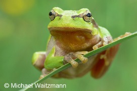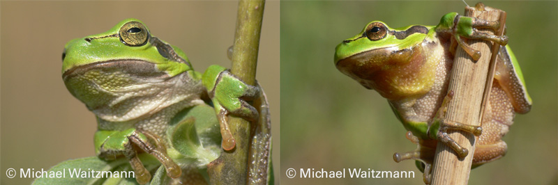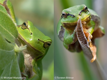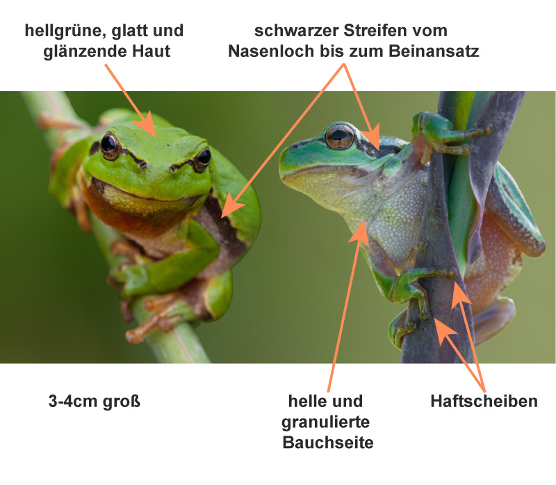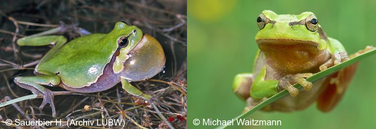 Description: Der Europäische Laubfrosch (Hyla arborea) ist unser kleinster einheimischer Frosch. Seine Haut ist glatt und glänzend, die Oberseite ist so leuchtend grün gefärbt, dass der Ausdruck „Laubfroschgrün" geprägt wurde. Laubfrösche sind gute Kletterer, die sogar an Glasscheiben haften können, da sie an Finger- und Zehenspitzen kleine, runde Haftballen besitzen. Früher wurde die Art oft in Einweckgläsern mit einer kleinen Leiter gehalten: kletterte der Frosch nach oben, so wurde sonniges Wetter erwartet, blieb er unten, so galt dies als Schlechtwettervorhersage. Gesamtlänge: 3 bis 4 cm Gewicht: ca. 6 g Der Laubfrosch bevorzugt Lebensräume mit hohem, schwankendem Grundwasserstand und gebüschreichem, ausgedehntem Feuchtgrünland. Er ist eine Charakterart heckenreicher, extensiv genutzter Wiesen- und Aue-landschaften. Seine Laichgewässer weisen flache Ufer und vertikale Strukturen wie Röhricht auf und sind gut besonnt. Die geeigneten Lebensräume reichen von naturnahen Flussauen über Teichlandschaften bis hin zu Kies- und Tongruben. Vollbeschattete Gewässer meidet er. Laubfrösche sind sowohl tag- als auch nachtaktiv. Im Laubwerk von Hochstauden, Sträuchern oder lichten Bäumen sonnen sie sich oder jagen nach Beute - im Sprung mit weit herausgeschleuderter Zunge. Auf ihrem Speisezettel stehen vor allem Fliegen, Käfer und Spinnen. Die Larven weiden vornehmlich Algen ab, gedeihen aber besser, wenn auch tierische Nahrung verfügbar ist. Zur Paarungszeit halten sich die Männchen in Gruppen im oder am Laichgewässer auf und versuchen nach Sonnenuntergang durch ihren Balzgesang Weibchen anzulocken. Die Rufe klingen wie „äpp-äpp-äpp", sind sehr laut und manchmal noch in einer Entfernung von über einem Kilometer hörbar. Die Eier werden in Form von walnussgroßen Laichballen an Wasserpflanzen abgelegt. Nach knapp einer Woche schlüpfen die Larven aus den Eiern, die Entwicklung von der Larve zum Jungfrosch dauert ca. 40 bis 90 Tage. Durch diese recht kurze Entwicklungsdauer ist die Art in der Lage, auch temporäre Gewässer zu besiedeln. Der Europäische Laubfrosch besiedelt weite Teile Europas und der Türkei. Im Westen reicht das Verbreitungsgebiet bis an die Atlantikküste, im Osten bis weit in die Ukraine und in den Kaukasus. Die nördlichsten Vorkommen finden sich in Dänemark und Südschweden, die südlichsten auf Kreta. Im westlichen Mittelmeerraum wird die Art durch andere, nahe verwandte Arten ersetzt. In Deutschland ist der Europäische Laubfrosch weit verbreitet, größere Verbreitungslücken bestehen jedoch im Nordwesten und Westen des Landes. In Baden-Württemberg liegen die Verbreitungsschwerpunkte der Art am Oberrhein und im Bodenseegebiet. Der Laubfrosch bevorzugt vor allem die tieferen Lagen, kann aber an geeigneten Standorten bis in Höhen von über 700 m ü. NN vorkommen. Landesweit sind die Bestände - vor allem im Oberrheingebiet - seit Jahrzehnten im Rückgang begriffen. Die FFH-Richtlinie ist eine Naturschutz-Richtlinie der EU, deren Namen sich von Fauna (= Tiere), Flora (= Pflanzen) und Habitat (= Lebensraum) ableitet. Wesentliches Ziel dieser Richtlinie ist die Erhaltung der Biologischen Vielfalt durch den Aufbau eines Schutzgebietssystems. Neben der Ausweisung von Schutzgebieten (FFH-Gebieten) für Arten des Anhangs II wird der Erhaltungszustand dieser und der Arten des Anhangs IV und V überwacht. Download Zusammenfassung [pdf 492KB] Sehr charakteristisch für den Laubfrosch ist sein Ruf . Viele kennen diesen, besonders wenn man in der Nähe von einem Vorkommen wohnt. Die Rufe sind besonders intensiv zur Hochphase der Paarungszeit zu hören, dann teilweise auch am Tag, meist jedoch erst nach Sonnenuntergang. Neben dem Laubfrosch gibt es auch andere grüne Frösche! Hier besteht eine gewisse Verwechslungsgefahr! Grünfrösche oder auch Wasserfrösche sind bei uns weitverbreitet und man findet sie in vielen verschiedenen Gewässertypen. Die drei einheimischen Wasserfrösche sehen sich sehr ähnlich und rufen auch sehr ähnlich. Den typischen Ruf von Grünfröschen identifiziert wohl jeder als Froschquaken. Er ist mit dem eher bellenden Rufen des Laubfrosches nicht zu verwechseln (siehe oben). Teichfrosch und Seefrosch sind deutlich größer (8cm und mehr) und selbst der Kleine Wasserfrosch ist meist größer als ein Laubfrosch (über 4cm). Anders als bei einem Laubfrosch besitzen die meisten Grünfrösche viele schwarze Flecken und Punkte auf der gesamten Oberfläche. Ihre Haut ist niemals glatt wie bei einem Laubfrosch sondern besitzt immer Warzen. Außerdem haben Wasserfrösche auch keine Haftscheiben an den Fingerspitzen und klettern niemals. Weiterhin halten sich Wasserfrösche, wie man es von dem Namen schon erwarten kann, immer in Gewässernähe auf und sitzen auch außerhalb der Paarungszeit häufig im Wasser oder an den Gewässerrändern. Sollten Sie sich bei der Bestimmung Ihres Fundes unsicher sein, laden Sie am besten ein Foto des Tieres bei der Fundmeldung mit hoch! Sollten Sie sich ganz unsicher sein, können Sie uns das Bild des Fundes auch per E-Mail schicken. Bitte melden Sie uns Funde von Laubfröschen in Baden-Württemberg. Durch die Sammlung dieser Daten entsteht ein guter Überblick über die Verbreitung des kleinsten heimischen Frosches in Baden-Württemberg. Jeder kann also mit einer gemeldeten Beobachtung dazu beitragen diese gefährdete Art zu schützen, denn nur wenn wir wissen, wo die Tiere vorkommen, können wir sie auch erhalten. Ob einzelnes Tier, rufendes Männchen oder eine Gruppe Jungtiere, jede Meldung aus Baden-Württemberg ist wichtig! Häufig werden Beobachtungen auf Spaziergängen entlang von kleinen Gewässern oder auch an Waldrändern gemacht. Der typische Ruf lässt genauso auf die Tiere zurückschließen wie eine Sichtung. Für die Bearbeitung der Meldungen ist ein Ton- oder Bildnachweis wesentlich. Dies dient dazu, Verwechslungen mit anderen Arten (beispielsweise dem Teichfrosch) auszuschließen. Hin