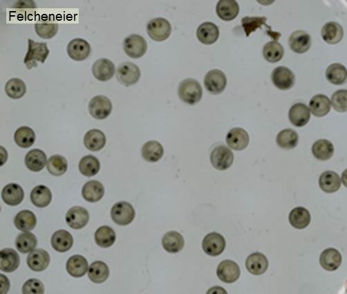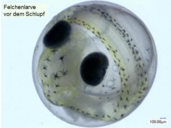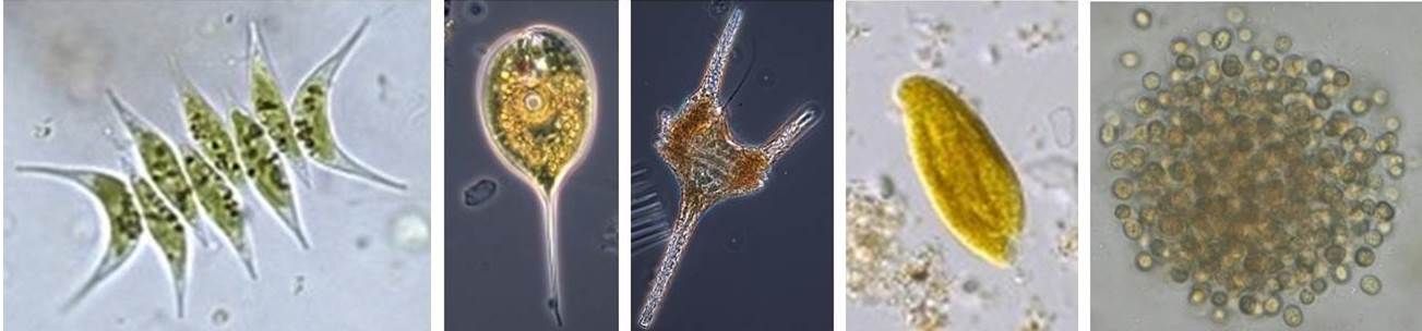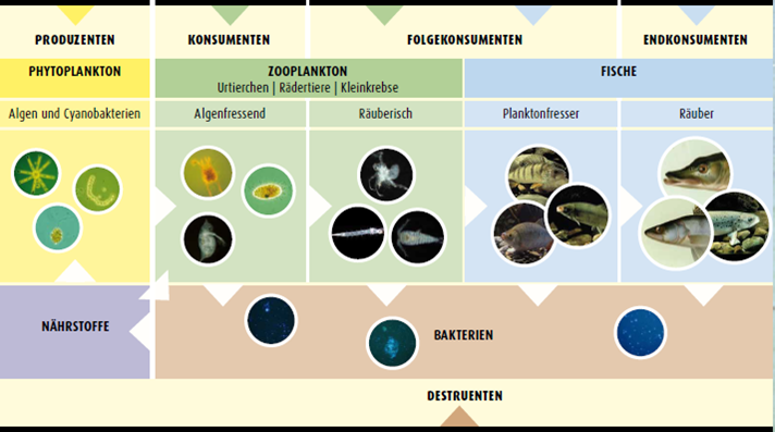 Description: Da bei vielen Seen der Freiwasserraum den vorherrschenden Anteil am Wasserkörper bildet, wird im allgemeinen auch der Schwerpunkt der hydrobiologischen Untersuchungen auf die Lebensgemeinschaft des Freiwassers gelegt. Diese besteht einerseits aus dem passiv mit dem Wasserkörper driftenden Plankton mit Phytoplankton als Primärproduzenten, Zooplankton als Konsumenten und den heterotrophen Mikroorganismen als Destruenten, und andererseits aus dem aktiv gerichtet schwimmenden Nekton, wozu insbesondere die Fische zählen. Plankton und Nekton sind die Akteure im ständigen Stoffkreislauf des Sees. Die im Plankton vorkommenden Arten werden laufend vom Institut für Seenforschung meistens an einer Station (Seemitte) in regelmäßigen Zeitabständen überwacht (14 täglich bis monatlich). Beim Phytoplankton handelt es sich um mikroskopisch kleine, im Wasser schwebende phototrophe Organismen, die einerseits zur Pflanzengruppe der Algen und andererseits zur Bakteriengruppe der Cyanobakterien gehören. Als photoautrophe Planktonorganismen bauen sie aus im Wasser gelösten Nährsalzen und Kohlensäure mit Hilfe des Sonnenlichts ihre Körpersubstanz auf. Sie stellen daher als „Primärproduzenten“ die Basis der Nahrungskette dar, die direkt oder indirekt als Energie- und Kohlenstoffquelle für alle anderen Organismen in einem Gewässer dient. Sowohl die Biomasse als auch die Artenzusammensetzung des Phytoplanktons sind wichtige Hinweise auf den Zustand eines Gewässers: eine niedrige Biomasse zeigt im Allgemeinen an, dass im Gewässer ein niedriges Nährstoffniveau herrscht, ein hohes Nährstoffniveau wird zu einer hohen Biomasse führen. Bestimmte Arten sind typisch für höhere Nährstoffkonzentrationen, andere Arten werden nur bei niedrigeren Konzentrationen gefunden, wieder andere Arten sind von der Nährstoffkonzentration weitgehend unabhängig. Das Phytoplankton wird nach Zusammensetzung und Biomasse erfasst. Dabei werden die Großgruppen der Cyanobakterien (Blaualgen) und der eukaryontischen Algen mit Euglenophyta (Augenflagellaten) Chromophyta (Kieselalgen u. Goldalgen), Dinophyta (Panzerflagellaten), Cryptophyta (Schlundalgen) und Chlorophyta (Grünalgen) durch Zählung der jeweils zugehörigen Einzelarten erfasst. Eine Abschätzung der Biomasse und der Gruppenzusammensetzung kann auch über die chemische Bestimmung der Algenpigmente erfolgen. Fotos: Diverse Phytoplankton-Arten unter dem Mikroskop. Von links nach rechts: Scenedesmus, Phacus, Ceratium, Cryptomonas, Microcystis. Die wichtigsten Gruppen des Zooplanktons sind die Kleinkrebse mit Cladoceren („Wasserflöhe“) und Copepoden („Hüpferlinge“), die Rotatorien („Rädertiere“), die Protozoen (Urtiere) mit Flagellaten und Ciliaten. Die meisten Arten ernähren sich von Algen, einige auch von Bakterien, wieder andere räuberisch durch Fressen anderer Zooplankter. Die Produktion des Zooplanktons (Wachstum und Fortpflanzung) ist im Wesentlichen abhängig von der Art und der Menge der vorhandenen Futteralgen sowie von der Temperatur. Daher ist in der Regel die Produktion im Sommer beschleunigt und im Winter verlangsamt. Die Art, Größe und Form der Algen bestimmt ihre Fressbarkeit. Die Menge der fressbaren Algen beeinflusst insbesondere bei hohen sommerlichen Temperaturen die Wachstums- und Fortpflanzungsgeschwindigkeit des algenfressenden Zooplanktons. Die Konkurrenz der einzelnen Zooplanktonarten um die gemeinsame Nahrungsgrundlage ist sehr komplex und von zahlreichen artspezifischen Faktoren abhängig. Durch den Fraß von einzelnen „bevorzugten“ Phytoplanktonarten ändern sich die Wachstumsbedingungen der verbleibenden Phytoplanktonarten. Die resultierenden Änderungen in Qualität und Quantität des „Phytoplanktons“ wirken sich wiederum auf das "Zooplankton" aus. Das „Zooplankton“ seinerseits dient als Nahrungsgrundlage für räuberische Zooplanktonarten und für Fische. Auch hier gibt es komplexe Wechselwirkungen. Menge und Zusammensetzung des Zooplanktons geben daher insbesondere Auskunft über die Struktur des Nahrungsnetzes in einem Gewässer und stellen somit neben der Trophie eine weitere wichtige Informationsquelle zur Zustands-Bewertung eines Gewässers dar. Das Zooplankton wird entweder durch Netzfänge (Crustaceen und Rotatorien) oder durch Schöpfproben (Protozoen) aus unterschiedlichen Tiefen erfasst und mikroskopisch ausgewertet. Fotos: Diverse Zooplankton-Vertreter unter dem Mikroskop. Ruderfußkrebs (links); Wasserfloh (mittig); Rädertierchen (rechts). Neben den pflanzlichen (Produzenten) und tierischen Vertretern des Planktons (Konsumenten) bilden die mikroskopisch kleinen heterotrophen Mikroorganismen (Destruenten) sowohl im Hinblick auf Biomasse als auch für die Stoffkreisläufe eine dritte wichtige funktionelle Gruppe der Lebensgemeinschaft des Freiwassers. Zu dieser zählen einerseits die heterotrophen Bakterien, andererseits einzellige bakterienfressende Urtierchen (Protozoen), darunter vor allem Geißeltierchen (Flagellaten) und Wimpertierchen (Ciliaten). Die Bakterien erfüllen zusammen mit den bakterienfressenden Urtieren über die sogenannte Detritus-Nahrungskette (microbial loop) vorrangig die Funktion des Abbaus der organischen Substanz und damit der Regeneration von Nährstoffen. Über die so ermöglichten kurzgeschlossenen Stoffkreisläufe in der Freiwasserzone können die heterotrophen Mikroorganismen maßgeblich die Produktivität eines Gewässers mitbestimmen. Im Vergleich zum klassischen Plankton ist die Kenntnis der Artzusammensetzung der heterotrophen Mikroorganismen bislang noch sehr unzureichend, was vor allem auf methodischen Schwierigkeiten beruhte. Daher wurden bis jetzt Indikationsansätze, die auf der Artzusammensetzung beruhen, für diese Gruppe kaum entwickelt. Eine Ausnahme bilden die relativ leicht nachweisbaren Fäkal-Indikatoren (v.a. E. coli), die als Darmbakterien üblicherweise in natürlichen Gewässern nicht vorkommen. Deren Nachweis zeigt som