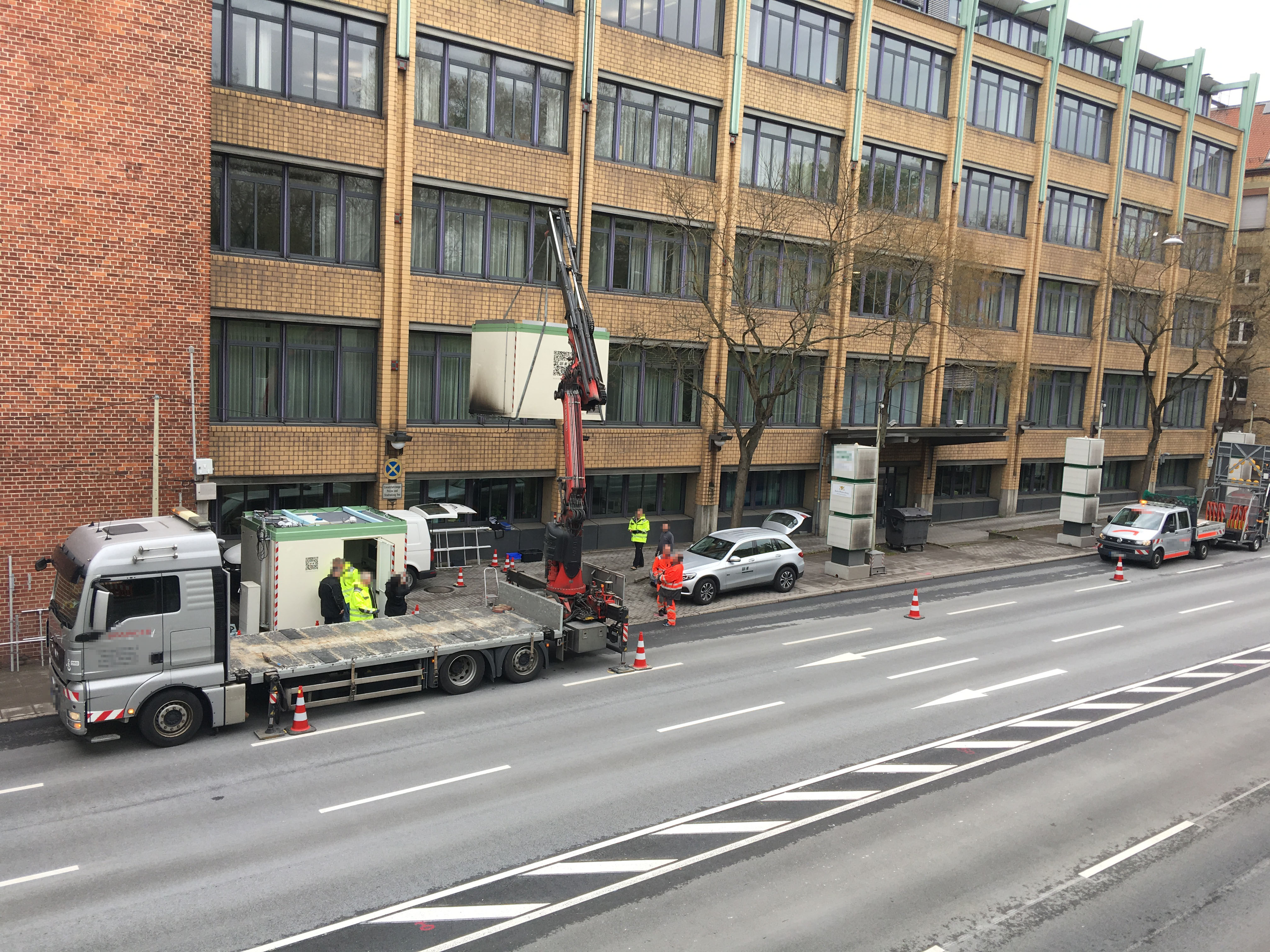 Description: null Messstelle „Stuttgart am Neckartor“ Seit Samstagabend (6.4.) war die Spotmessstelle „Stuttgart am Neckartor“ zur Überwachung der Luftqualität an der B14 aufgrund eines Schwelbrandes außer Betrieb. Heute nun konnte eine Ersatzmessstation dort aufgestellt werden. Nachdem die Polizei die zerstörte Messstation freigegeben und letzte Spuren gesichert hat, konnte die neue Messstation an der Stelle der alten installiert werden. Damit ist gewährleistet, dass die Daten weiterhin vergleichbar sind und die Messreihen nach der Unterbrechung fortgeführt werden können. Die Messstation wird derzeit angeschlossen und geprüft mit dem Ziel, dass ab Donnerstag 18.4. auch wieder die kontinuierlichen Daten der Messungen von Feinstaub PM10 und Stickstoffdioxid online zur Verfügung stehen. Die Vorgaben aus den EU-Berichtspflichten können eingehalten werden. Nach einem Schwelbrand wurde die bisherige Messstation mitsamt ihren empfindlichen Geräten vollständig zerstört. Alle Messungen sind seither unterbrochen. Der Ersatz der Station beläuft sich auf eine Summe von rund 250.000€.
