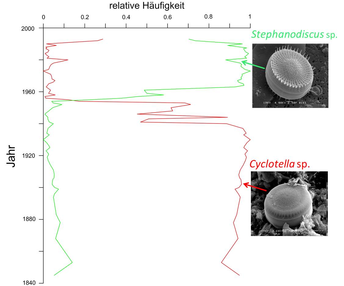 Description: Der Bodensee ist mit 536 km 2 der zweitgrößte Alpensee Europas. Er gliedert sich in den größeren und tieferen Obersee mit Überlinger See sowie den flacheren Untersee mit den Seeteilen Zellersee, Gnadensee und Rheinsee. Verbunden werden Ober- und Untersee über den Seerhein bei Konstanz. Die beiden größten Zuflüsse sind der Alpenrhein und die Bregenzerach, der Abfluss befindet sich bei Stein am Rhein. Das 11500 km 2 große Einzugsgebiet liegt zum größten Teil in den Alpen und erstreckt sich bis an die Grenze von Italien. Der saisonale Wasserstandsverlauf des Bodensees wird durch das alpine Einzugsgebiet geprägt: Im Winter (Februar) sind die Wasserstände am niedrigsten, weil der Niederschlag als Schnee und Eis festgehalten wird. Im Sommer (Juni/ Juli) werden die höchsten Wasserstände erreicht, wenn Schnee und Eis abgeschmolzen sind. Da der Wasserstand des Bodensees nicht reguliert ist, schwankt er natürlicherweise um ca. 1,5 m im Jahr. Der See ist natürlicherweise monomiktisch mit einer vertikalen Frühjahrszirkulation. In den Sommermonaten tritt regelmäßig eine lang anhaltende Schichtung auf. In den letzten Jahren wurde vermehrt das Ausbleiben der Vollzirkulation beobachtet. In den Wintermonaten kann die Sichttiefe Werte von 10-15m und während des Sommers 5 m erreichen. (Zum Vergrößern bitte Bild anklicken) Das Wasser ist leicht basisch. Die Nährstoffkonzentrationen sind in dem für diesen Seentyp zu erwartenden oligotrophen Bereich (Phosphor 6-7 µg/L). Die langjährige mittlere Calciumkonzentration liegt bei 1,2 mmol/L (48 mg/L). Mitte der fünfziger Jahre des letzten Jahrhunderts begann die Phosphorkonzentration und mit ihr die pflanzliche Produktion im See stark zuzunehmen (Eutrophierung). Ende der siebziger Jahre wurden Konzentrationen von über 80 µg/L gemessen. Vor allem der mit den höheren Biomassen einhergehende intensivere Abbau führte zeitweise zu Sauerstoffmangelsituationen am Seegrund mit Werten, die deutlich unter 5 mg/L lagen. Sauerstoff am Seeboden ist eine wichtige Voraussetzung für höheres Leben am Seegrund. Um der Eutrophierung und deren negativen Folgen entgegenzuwirken, wurde im gesamten Einzugsgebiet mit dem Ausbau der Kläranlagen begonnen. Ab den achtziger Jahren konnte ein Rückgang der Phosphorkonzentrationen (Reoligotrophierung) im Bodensee beobachtet werden. Heute liegen die Phosphorkonzentrationen mit Werten um die 6-7µg/L wieder in einem typischen Bereich. Die Lebensgemeinschaften des Bodensees veränderten sich im Zuge der Eutrophierung und der darauf folgenden Reoligotrophierung zum Teil erheblich. Heute entsprechen sie wieder weitgehend dem Typ nährstoffarmer, tiefer Alpenseen. Beispiel Phytoplankton: Mit der Zunahme der Nährstoffe stieg die Gesamt-Algenbiomasse an und es kam zu Algenblüten. Trotz deutlicher Phosphatreduktion in den 1980er Jahren verharrte die Gesamtbiomasse noch etwa 10 Jahre auf gleichbleibend hohem Niveau (ca. 1 mg/L), obwohl der Phosphatgehalt stetig abnahm. Die Abnahme der Biomasse in einzelnen Algenklassen wurde durch die Zunahme der Biomasse in anderen Algenklassen kompensiert. Dieser Hysterese-Effekt (Fortdauer einer Wirkung bei Wegfall der Ursache) ist in der Natur häufig zu beobachten. Heute liegt die Gesamtbiomasse wie Ende der 1950er Jahre bei ca. 0,5 mg/L. Die Veränderungen in den Nährstoffverhältnissen zeigen sich auch in der Artenzusammensetzung (s. Abb.). Während mit zunehmender Eutrophierung die Kieselalgen der Gattung Cyclotella zurückgingen, traten verbreitet Arten der Gattung Stephanodiscus auf. Im Zuge der Reoligotrophierung übernahmen die Cyclotella -Arten wieder die Vorherrschaft, die typischerweise in einem oligotrophen See zu finden sind. Beispiel Zooplankton: Für das herbivore Zooplankton war mit dem Anstieg der Phytoplanktonbiomasse der Tisch reich gedeckt, so dass auch das Zooplankton zahlenmäßig zunahm. Für einige Arten wie Bosmina sp. und Daphnia galeata , die erst in den 1970er Jahren in den Bodensee eingewandert sind, zeigte sich eine enge Kopplung an die Trophieverhältnisse. Andere Arten verschwanden, z.B. wurde Diaphanosoma brachyurum 1962 im Plankton nicht mehr nachgewiesen. Erst seit dem Jahr 2001 findet man die Art wieder regelmäßig in den Planktonproben. Foto: Diaphanosoma brachyurum unter dem Mikroskop. Da das Zooplankton die Hauptnahrungsgrundlage für zahlreiche Fischarten ist, änderten sich im Zuge der Eutrophierung auch die Fischbestände im Bodensee. Vor allem der Barsch stellte zur Zeit des eutrophierten Sees seine ursprüngliche Nahrung von Fischen und Zoobenthos weitgehend auf Zooplankton um. Heute, bei verringerten Zooplanktondichten ernähren sich bereits junge Barsche zunehmend von kleinen Fischen. Auch Felchen profitierten von der hohen Zooplanktondichte. Sie wuchsen so schnell, dass sie gefangen wurden, bevor sie zum ersten Mal abgelaicht hatten und damit für Nachwuchs sorgen konnten. Die Bestände brachen daher zunächst ein. Man erhöhte die Maschenweiten der Fischernetze und die Felchenbestände konnten sich wieder erholen. Im Zuge der Reoligotrophierung gehen die Fangzahlen bei den Felchen wieder zurück, aufgrund der verbesserten Wasserqualität werden aber z. B. wieder vermehrt Seesaiblinge gefangen. Beispiel Makrophyten: Auch die Makrophyten machten einen starken Wandel durch. Die für nährstoffarme Verhältnisse typischen Armleuchteralgen (Characeen) gingen zurück und wurden von Laichkräutern verdrängt. Vor allem das kammförmige Laichkraut ( Potamogeton pectinatus ) breitete sich sehr stark aus und bildete in der Flachwasserzone riesige Felder. In Strandbädern wurden die im Volksmund als „Schlingpflanzen“ bezeichneten Laichkräuter durch die „Seekuh“ entfernt, um Panik bei den Badenden zu vermeiden. Aufgrund des sauberen und klaren Wassers können sich heute die unterseeischen Wiesen mit Armleuchteralgen wieder bis über die Haldenkante ausbreiten. Sie stabilisieren den Seeboden, sind wichtige Strukturelemen