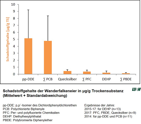 Description: Der Wanderfalke ( Falco peregrinus ) ist räumlich gesehen die am weitesten verbreitete Vogelart der Welt und zudem schnellster Jagdvogel. Durch seine Position am Ende des Nahrungsnetzes reichert er langlebige und fettlösliche Schadstoffe besonders an und erlitt so durch den Einsatz chlorhaltiger Pestizide, allen voran Dichlordiphenyltrichlorethan (DDT), in der Vergangenheit bedrohliche Bestandseinbußen. Durch das Verbot dieser Pestizide und den unermüdlichen Einsatz der Arbeitsgemeinschaft Wanderfalkenschutz erholte sich der Bestand wieder. Seit 1999 finanziert die LUBW Schadstoffuntersuchungen an abgestorbenen Resteiern auf bereits verbannte persistente Schadstoffe (POPs; persistant organic pollutants ), woraus Baden-Württembergs bislang einziges terrestrisches POP-Dauermonitoring entstand. Ebenfalls untersucht werden neue umweltrelevante Verbindungen, die aufgrund ihrer Toxizität und Langlebigkeit im Verdacht stehen, Mensch, Tier und Umwelt zu belasten. Bislang wurden mehr als 200 Substanzen aus verschiedenen Schadstoffgruppen untersucht, darunter die durch die Stockholmer Konvention verbotenen Organohalogen-Verbindungen, polychlorierten Biphenyle (PCB) und polychlorierten Dibenzodioxine und –furane (PCDD/PCDF). Weiterhin wurden klassische und neuere bromierte Flammschutzmittel, per- und polyfluorierte Verbindungen, Schwermetalle, polyaromatische Kohlenwasserstoffe, Chlorparaffine, Organozinnverbindungen, Phtalate sowie noch im Einsatz befindliche Biozide und Pflanzenschutzmittel untersucht. Mengenmäßig dominieren in den Wanderfalkeneiern der Insektizid-Metabolit Dichlordiphenyldichlorethen (DDE) sowie hochgiftige PCB . Die Belastung des für den Bestandseinbruch der Wanderfalken in den 1960er Jahren verantwortlichen DDE ist zwar dank des weitgehenden internationalen Verbotes von DDT stark zurückgegangen, überschreitet aber immer noch den Grenzwert für Hühnereier, welche zum Verzehr vorgesehen sind. Quecksilber ist in Wanderfalkeneiern zwar in wesentlich geringeren Konzentrationen zu finden, bewirkt aber aufgrund seiner starken Toxizität bereits in diesen Konzentrationen eine signifikante Reduktion der Schalendicke. Etwa 70 % des Gesamt-Quecksilbers liegen dabei als Methylquecksilber vor, das mehr als hundertmal toxischer als Quecksilber selbst ist und Auswirkungen auf Gehirn, Embryonalentwicklung und das Hormonsystem zeigen kann. Schon bei wesentlich geringeren Konzentrationen als sie in Wanderfalkeneiern gefunden wurden, zeigten sich beim Ibis Auswirkungen auf die Fortpflanzung. Die Quecksilber-Werte in den Eiern von Wanderfalken können daher möglicherweise ebenfalls Auswirkungen auf die Reproduktionsrate haben. Per- und polyfluorierte Chemikalien (PFC) stehen derzeit besonders im Fokus von Politik und Öffentlichkeit. Die als krebserzeugend und reproduktionstoxisch geltende Leitsubstanz Perfluoroktansulfonsäure (PFOS) weist in Wanderfalkeneiern das höchste Kontaminationsniveau von allen untersuchten PFC auf. In etwa 10 % der Fälle wird die Wirkungsschwelle im Hühnerei, die in Toxizitätsstudien zu schädlichen Effekten führte, überschritten. Diethylhexylphthalat (DEHP) , ein reproduktionstoxisches und möglicherweise krebserzeugendes Phthalat, wurde in der Hälfte der untersuchten Wanderfalkeneier gefunden. Die Anreicherung von polybromierten Diphenylethern (PBDE) in Wanderfalkeneiern, einer Gruppe von Flammschutzmitteln, ist dank des weitgehenden Verbots dieser Stoffgruppe in den frühen 2000er Jahren deutlich gesunken. PBDE kann, z. B. über eine Interaktion mit dem Hormonsystem, zur Schädigung der Gehirnentwicklung führen. Zugelassene Ersatzstoffe, die statt der verbotenen oder beschränkten „klassischen“ Flammschutzmittel eingesetzt werden, tauchen ebenfalls in der Umwelt auf. Auch konnten über 200 weitgehend unbekannte, i. d. R. polybromierte Verbindungen in Wanderfalkeneiern nachgewiesen werden. Trotz der genannten Nachweise kann aber auch für viele Verdachtsstoffe hinsichtlich der Anreicherung in Wanderfalkeneiern Entwarnung gegeben werden. So wurden einige untersuchte Substanzen der Avermectine, der Biozide, der nichtchlorierten Pestizide sowie der kurzkettigen Chlorparaffine, Organozinnverbindungen, Moschusxylol, Bisphenol A und Tetrabrombisphenol A nicht oberhalb der Bestimmungsgrenze in Wanderfalkeneiern detektiert. Dennoch zeigen die Untersuchungsergebnisse insgesamt die Notwendigkeit, die Belastung unserer Umwelt mit Schadstoffen dringend zu reduzieren. Die erhobenen Schadstoffdaten sollen in übergreifende Datenbanken, z. B. der Datenplattform IPCheM der EU-Kommission, integriert werden und so ggf. Eingang in regulatorische Prozesse finden. Weiterführende Informationen Schadstoffanreicherung in Wanderfalkeneiern aus Baden-Württemberg (2020), LUBW PFC in Wanderfalkeneiern (2013), LUBW Warndienst Wanderfalke (2012), LUBW Schwarz et al. (2016), Peregrine falcon egg pollutants. Toxikol Environ Chem 98(8): 886-923. v. d. Trenck et al. (2007), Bioindikation mit Wanderfalken. UWSF-Z Umweltchem Ökotox 19(2), 75-82.