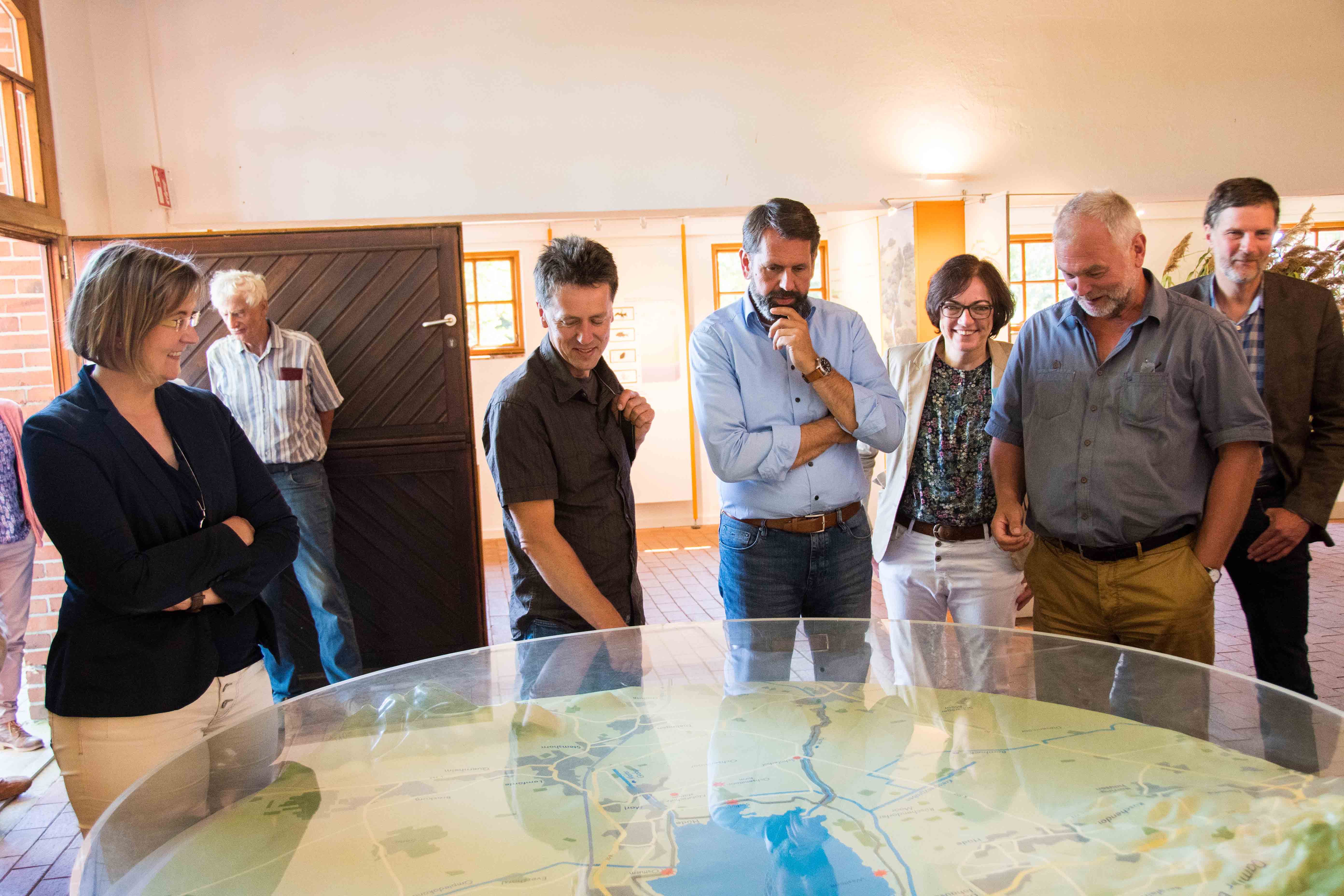 Neue Perspektiven auf den Dümmer: Mitarbeiter Heinrich Belting (2.v.r.) informierte im Rahmen des Besuchs von Umweltminister Olaf Lies (4.v.r.) und NLWKN-Direktorin Anne Rickmeyer (3.v.r.) über die Arbeit der Naturschutzstation.