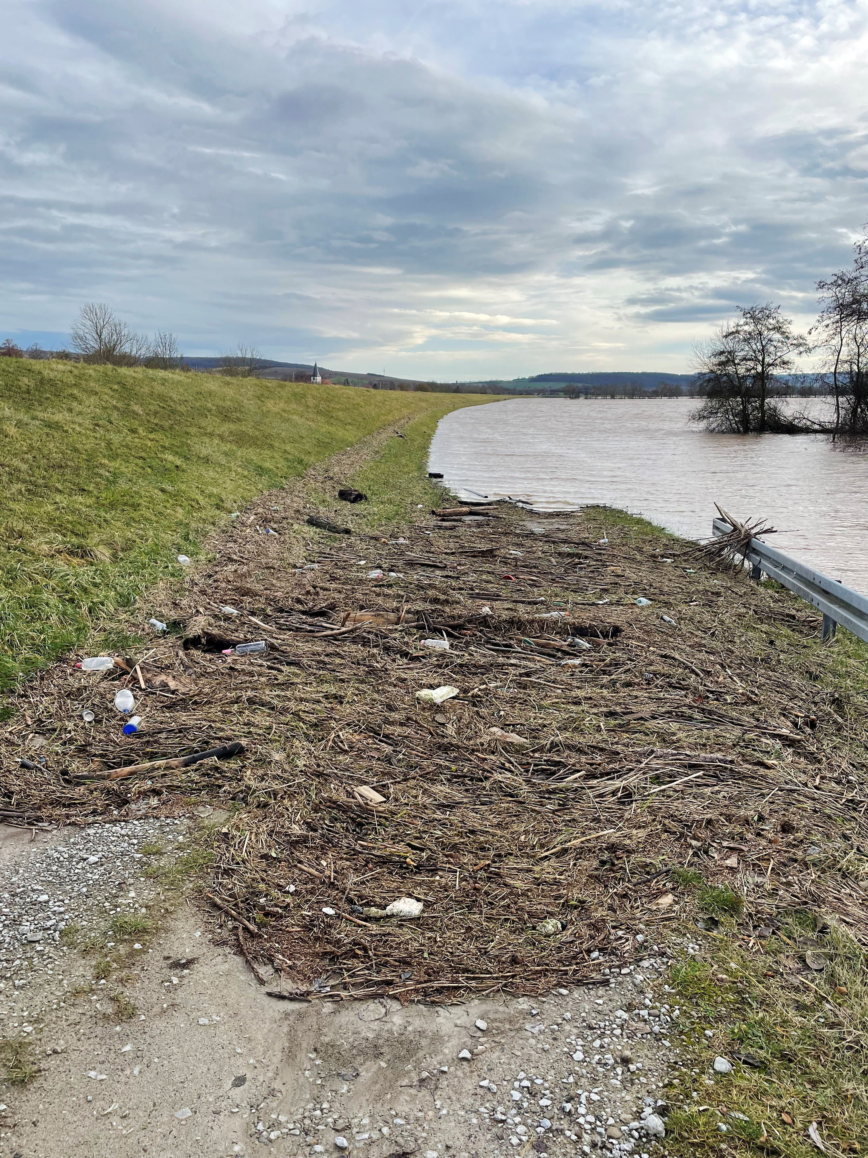 Eine hochwasserbedingte Müll- und Treibgutablagerung war beispielsweise am Hochwasserrückhaltebecken Salzderhelden zu beobachten, wie dieses Foto von der Innenseite des Polders 4 zeigt.