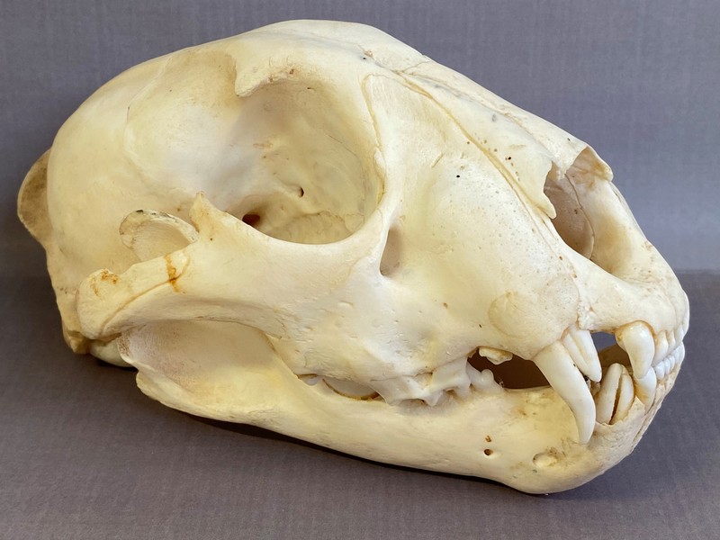 Der Zahnwechsel ist bei dem Schädel des sieben bis acht Monate alten Leopardenjunges gut zu erkennen: Man sieht den Eckzahn als Milchzahn und den nachwachsenden Zahn. (Foto: Linus Henkel, NLWKN)