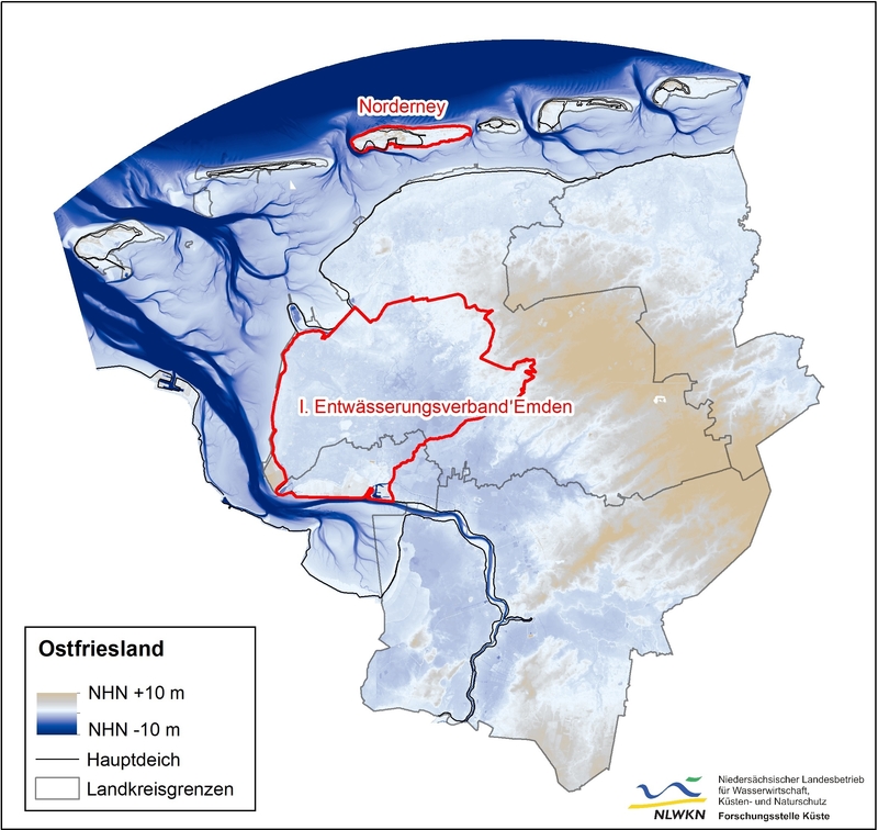 WAKOS-Untersuchungsgebiet mit den Schwerpunkten 1. Entwässerungsverband Emden und die Insel Norderney. (Karte: Cordula Berkenbrink/NLWKN)
