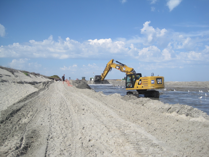 Als Sand-Wasser-Gemisch tritt das per Saugbagger gewonnene Material aus der Spülleitung am Langeooger Strand aus. Das Bild zeigt die zuletzt durchgeführte Aufspülung vor dem Langeooger Pirolatal 2022 (Bild: Thorenz/NLWKN).