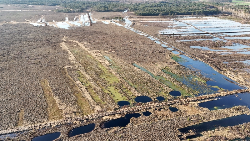 Winterliche Wasserhöchststände – auch dank der bereits durchgeführten Arbeiten: Im nördlichen Bissendorfer Moor wird das Regenwasser hinter den neu geschaffenen Dammlinien zurückgehalten (Foto: Marcel Hollenbach, Region Hannover).