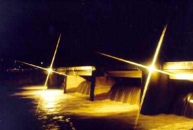 Description: Das Hochwasserrückhaltebecken Salzderhelden im Landkreis Northeim wurde zum Schutz des Leinetals vor Hochwasser errichtet und ist von überregionaler Bedeutung. Mit dem Bau des Hochwasserrückhaltebeckens Salzderhelden wurde im September 1972 begonnen. Seine offizielle Inbetriebnahme erfolgte nach erfolgreichem Probevolleinstau im März 1994. Betrieb und Unterhaltung der Anlage liegen in der Zuständigkeit des NLWKN. Vom gesamten Niederschlagseinzugsgebiet der Leine von 6.500 Quadratkilometern zwischen Quelle und Mündung beeinflusst das Hochwasserrückhaltebecken mit 2.200 Quadratkilometern ein gutes Drittel, darunter die niederschlagsstarken Gebiete des Harzes und seines Vorlandes. Kernstück der Anlage bildet das Abschlussbauwerk mit einer Länge von rund 116 Metern. Hierüber wird bei Hochwasser durch Steuerung der Verschlüsse der Abfluss in das Unterwasser geregelt. Dammbauwerke umfassen die 5 Polder und bilden auf einer Länge von rund 26 Kilometern den Abschluss des Hochwasserrückhaltebeckens gegenüber den tiefer liegenden Ortslagen der Randgemeinden und den angrenzenden Verkehrsinfrastrukturen. Die Regelung der Vorflut in den Poldern, und ihre Entleerung bei einem Einstau erfolgt mittels vier Siele bzw. Polderschöpfwerke. Die Binnenvorflut der Randbereiche wird über weitere drei Siel- und Schöpfwerke sichergestellt. Im Hochwasserfall wird der über der Unterwasserabgabe auflaufende Zufluss zunächst im Polder 1 zurückgehalten. Ist dessen Kapazität von 16 Millionen Kubikmetern überschritten, fließt das Wasser über spezielle gestaffelte Überlaufstrecken in die Polder 2, 3 und 4. Der Polder 5 wird nur in Extremfällen genutzt. Insgesamt bieten die Polder ein Einstauvolumen von 37,4 Millionen Kubikmetern auf einer Fläche von circa 1.000 Hektar. Das neue, rechnergestützte Steuerungs- und Hochwasservorhersagemodell spiegelt das tatsächliche Niederschlags- und Abflussgeschehen des gesamten Leineeinzugsgebietes zwischen der Quelle und Hannover-Herrenhausen wider und liefert weit präzisere Prognosen über den zu erwartenden Verlauf eines Hochwasserereignisses als dies bisher möglich war. Während bisherige Modelle auch nur Aussagen über das Gesamtvolumen einer Hochwasserwelle ermöglichten, lassen sich mit dem neuen Modell genauere Werte über zu erwartende Wasserstände berechnen. Luftbild Hochwasserrückhaltebecken Salzderhelden Abschlussbauwerk Abschlussbauwerk bei Nacht